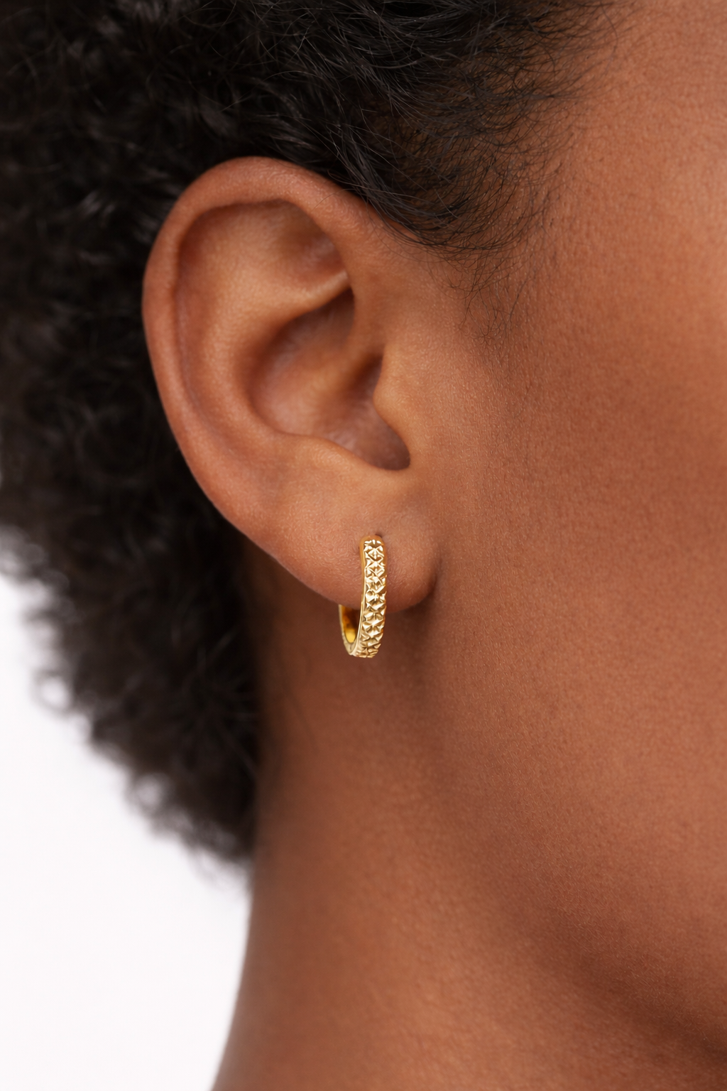 Exclusively forged in 14K solid gold, these hoops feature a meticulously faceted diamond-cut texture. This heritage-inspired pattern is designed to catch the light from every angle, creating a sophisticated interplay between brilliant golden highlights and deep, earthy shadows. Like the wisdom they honor, these hoops are crafted from solid metal to ensure they endure as a permanent part of your journey.